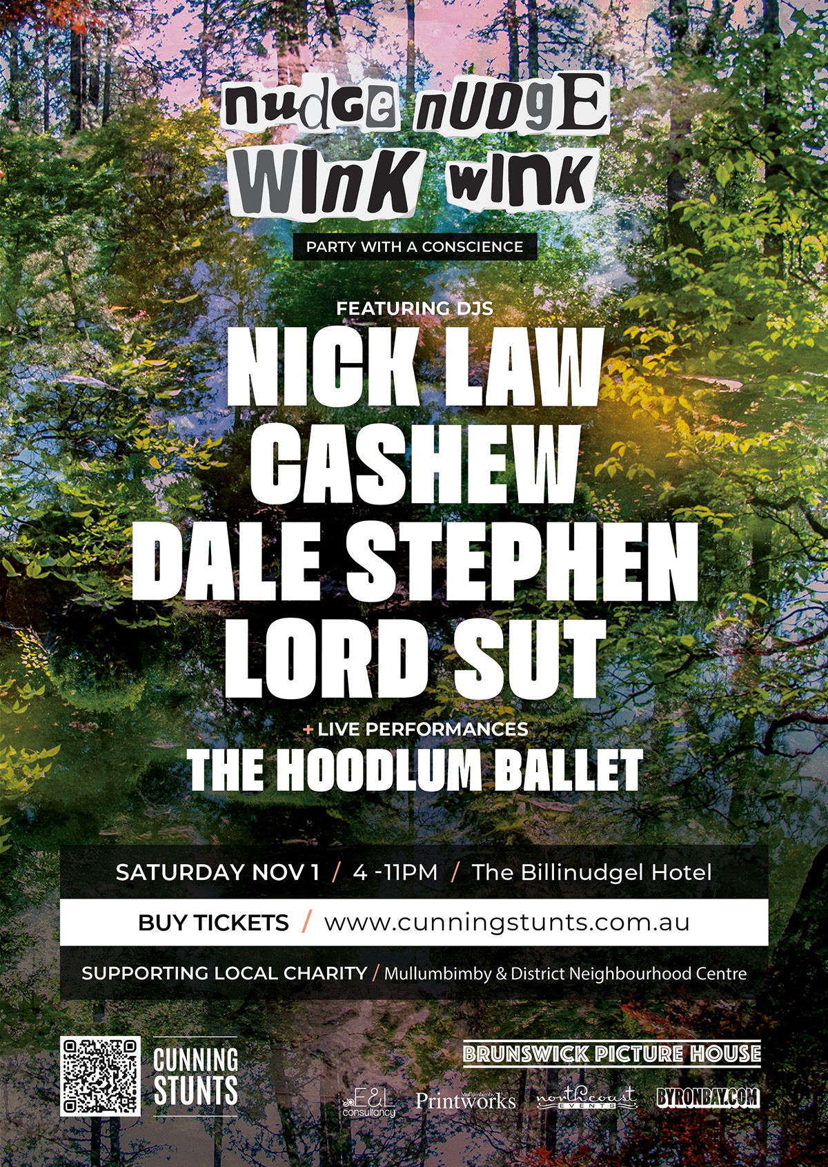Tickets: This event is expected to sell out. You can still support Mullumbimby & District Neighbourhood Centre by donating via the ticket link: https://bit.ly/Tickets_Nudge_Nov1st