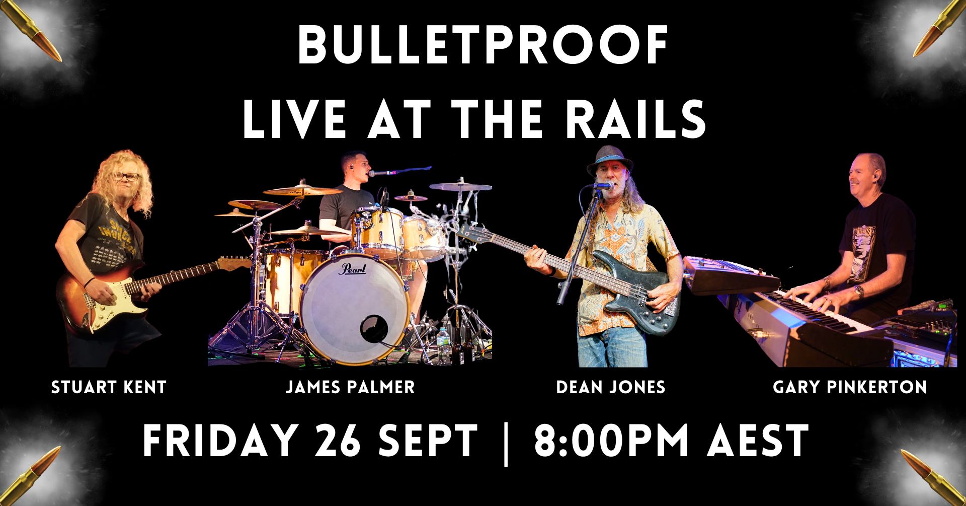 Bulletproof features Stuart Kent, lead vocalist and guitarist; James Palmer, musical director, master drummer, vocalist, and manager; Dean Jones, bass guitar and vocals; and Gary Pinkerton, ivory maestro on keyboards.