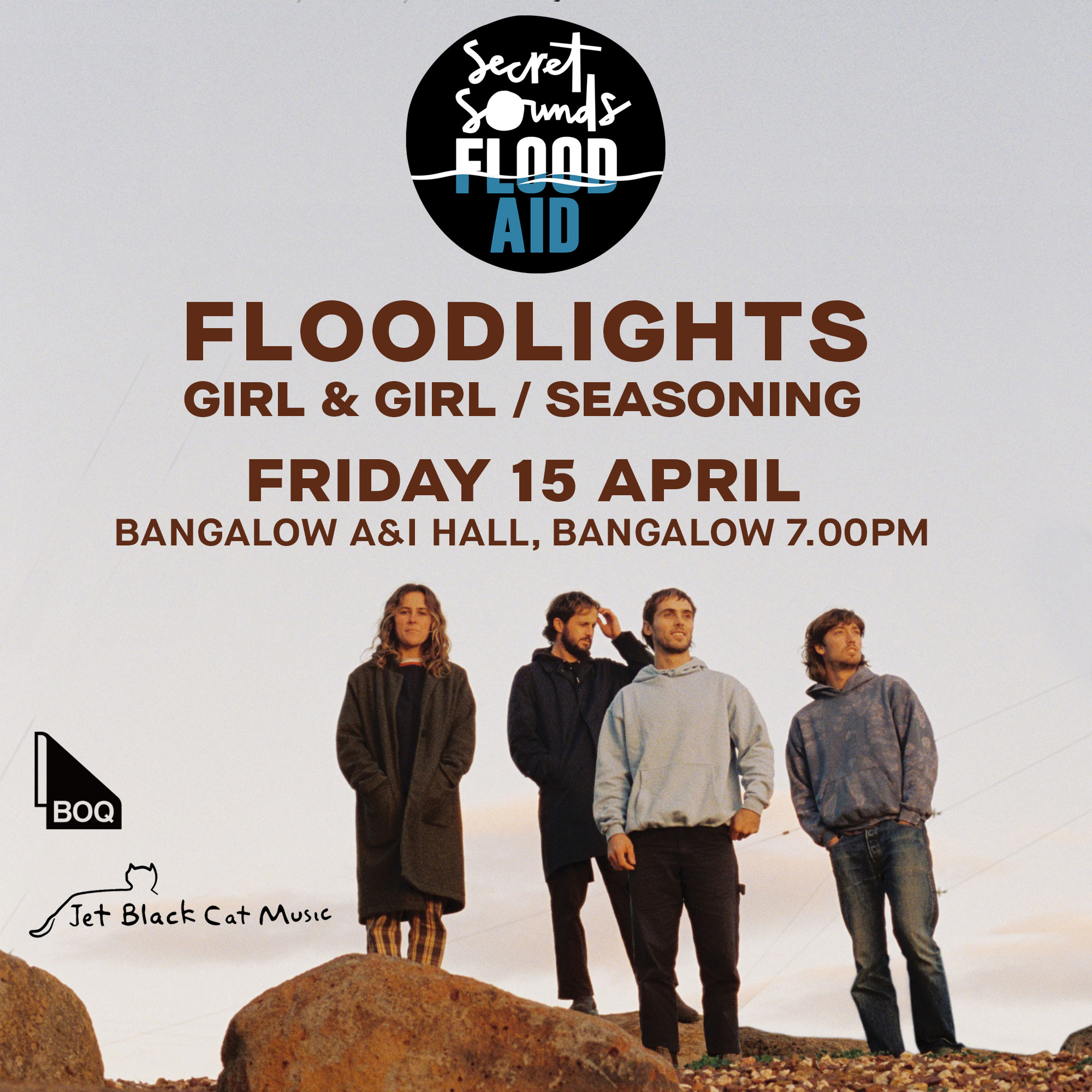 Continuing The Flood Aid series of concerts, proudly presented by The Bank of Queensland, Secret Sounds would like to announce that Floodlights, supported by Girl and Girl and Seasoning will be playing at Bangalow Hall on Friday 15th April (Good Friday) to continue to raise money on ground for those affected by the recent flood devastation in the region.